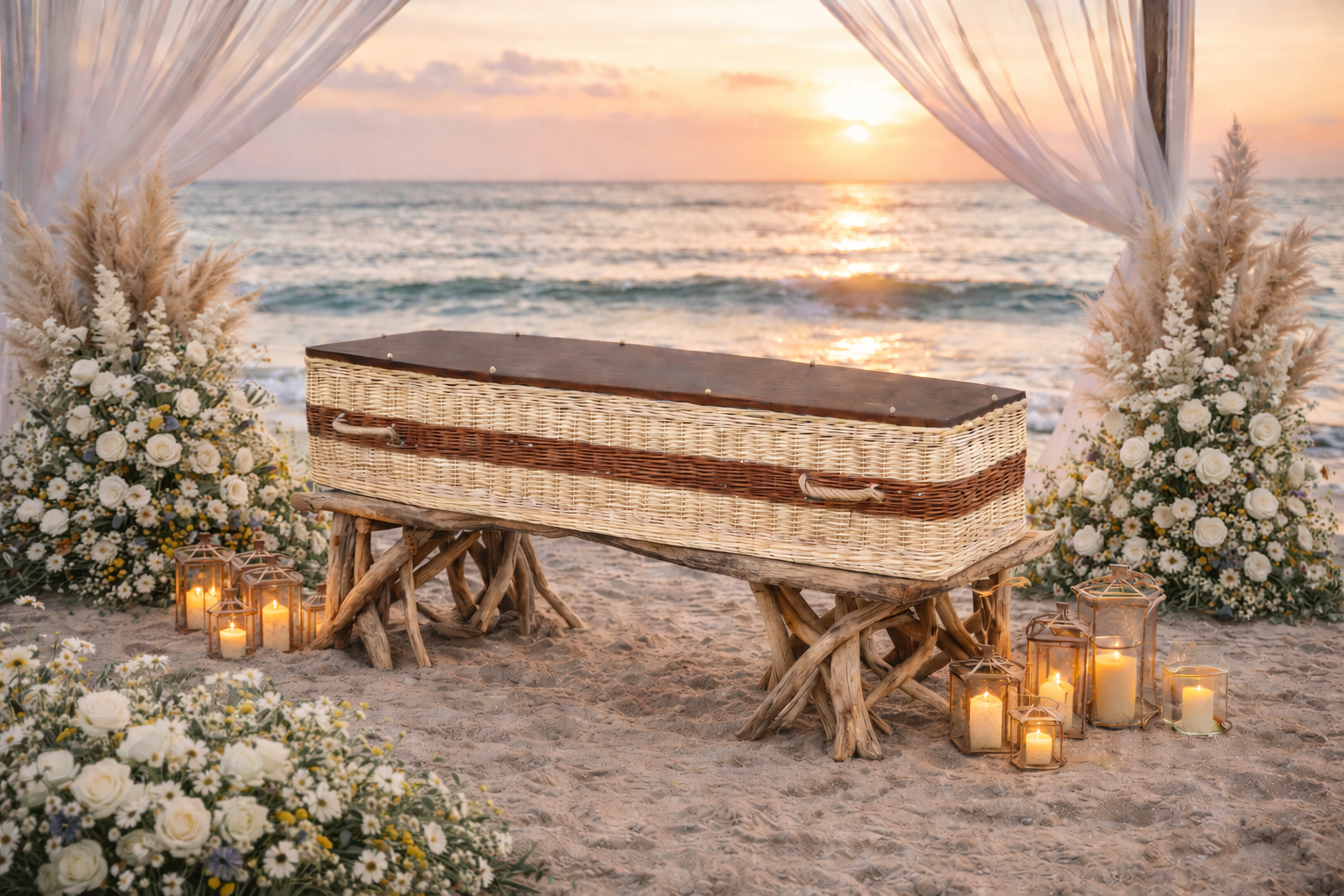 Le Bohemian est un cercueil en pin habillé d’osier, alliant élégance naturelle et durabilité, pour offrir une alternative respectueuse de l’environnement qui répond aux attentes éco-responsables.